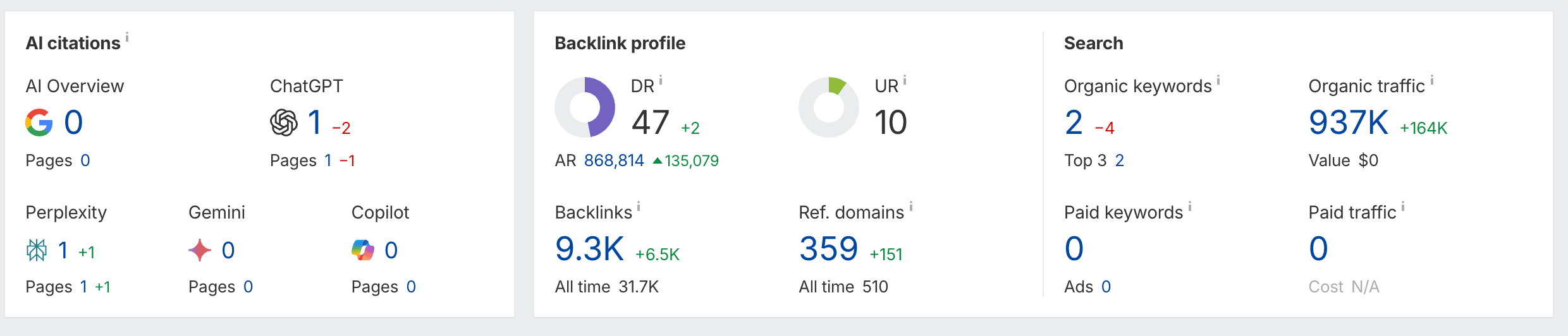 Its traffic value is $0. Its referring domain count grew by 151 in a single month. Its traffic went from near zero to 1 million in a matter of weeks. Individually, each of these data points is unusual.