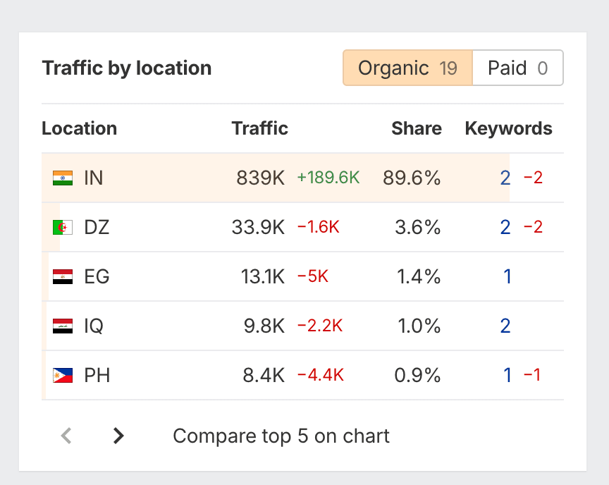 Beyond India, the site draws a surprisingly international audience for a local restaurant brand. Algeria comes in second with 33,900 visits (3.6%), though that figure dipped slightly by 1,600 from the prior month. Egypt follows at 13,100 visits (1.4%), down 5,000 month-on-month. Iraq contributes 9,800 visits (1.0%), a decrease of 2,200, and the Philippines rounds out the top five with 8,400 visits (0.9%), a decrease of 4,400.